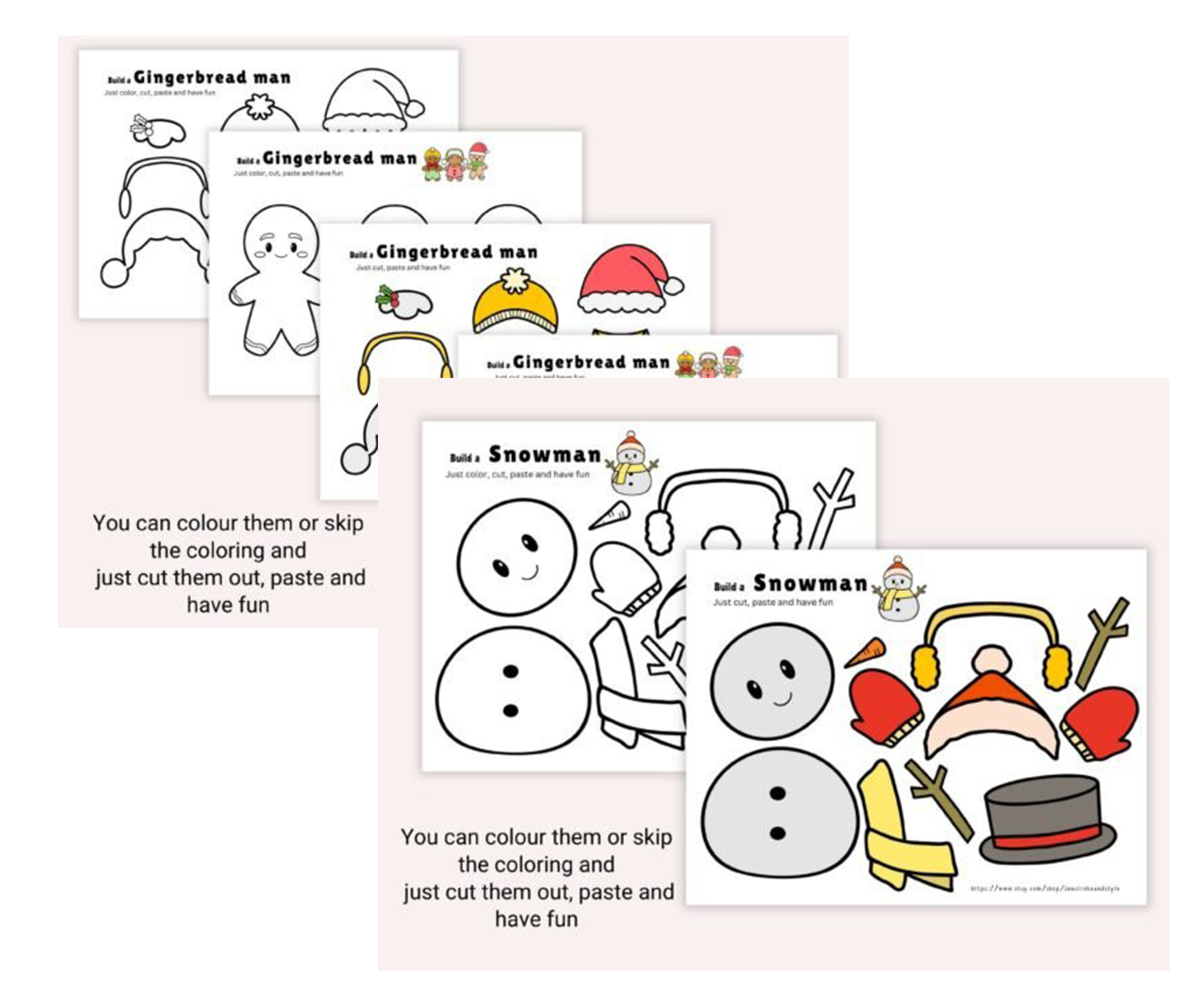 Build-a-Santa, build-a-snowman, ornament crafts, masks, puppets, envelopes, 3D trees & gingerbread houses.